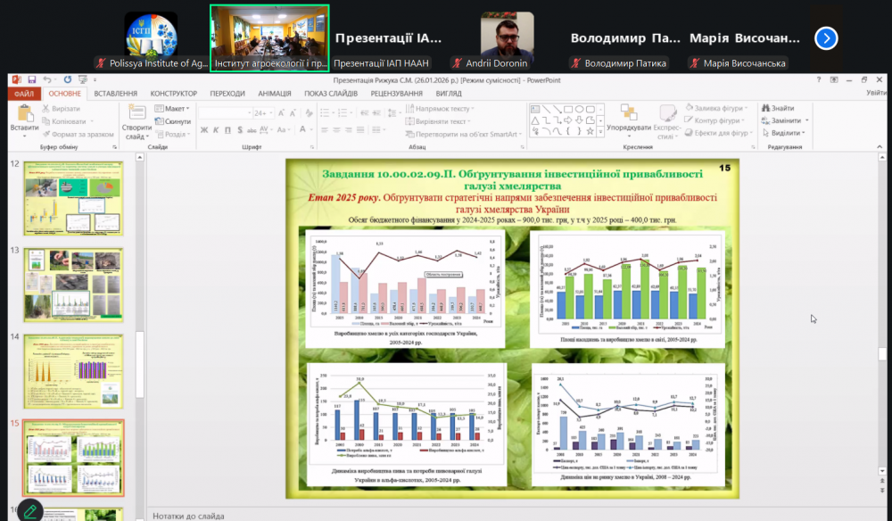 Зокрема, було заслухано звіти Національного наукового центру «Інститут ґрунтознавства та агрохімії імені О.Н. Соколовського» (академік НААН Станіслав БАЛЮК), Інституту сільськогосподарської мікробіології та агропромислового виробництва НААН (академік НААН Віталій ВОЛКОГОН) та Інституту сільського господарства Полісся НААН (академік НААН Сергій РИЖУК).