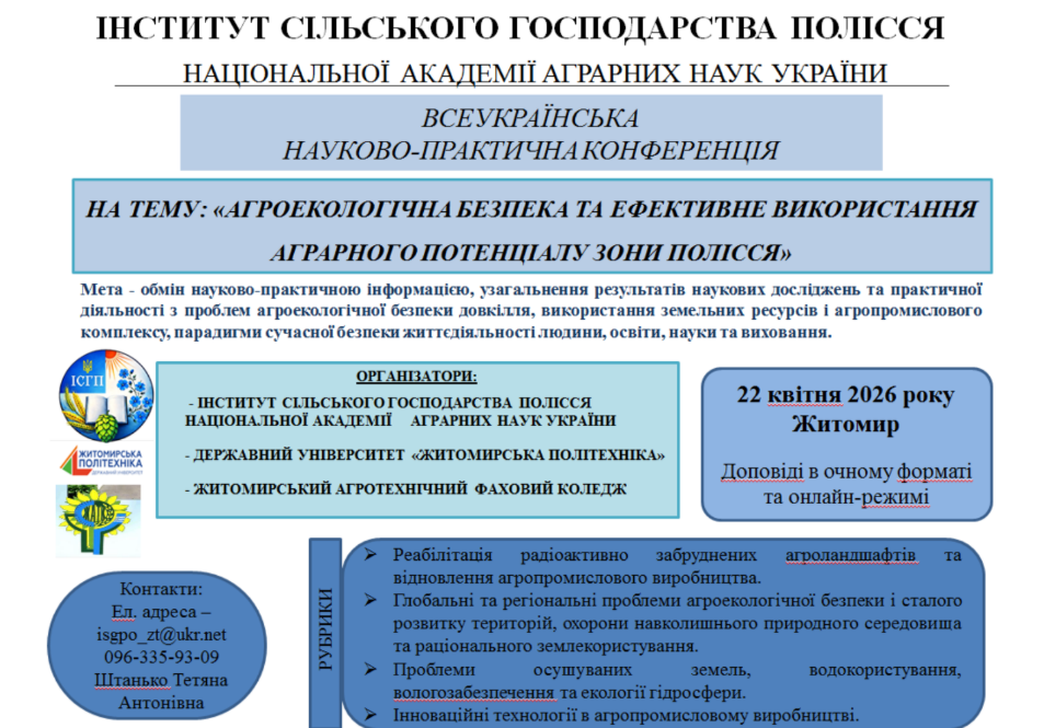 Всеукраїнська науково-практична конференція «АГРОЕКОЛОГІЧНА БЕЗПЕКА ТА ЕФЕКТИВНЕ ВИКОРИСТАННЯ АГРАРНОГО ПОТЕНЦІАЛУ ЗОНИ ПОЛІССЯ» 22 квітня 2026 року 10 квітня 2026 розмір шрифту зменшити розмір шрифту збільшити розмір шрифту Друк ЗАПРОШЕННЯ НА КОНФЕРЕНЦІЮ: zaproshennya--na-konferesiyu-2026.pdf