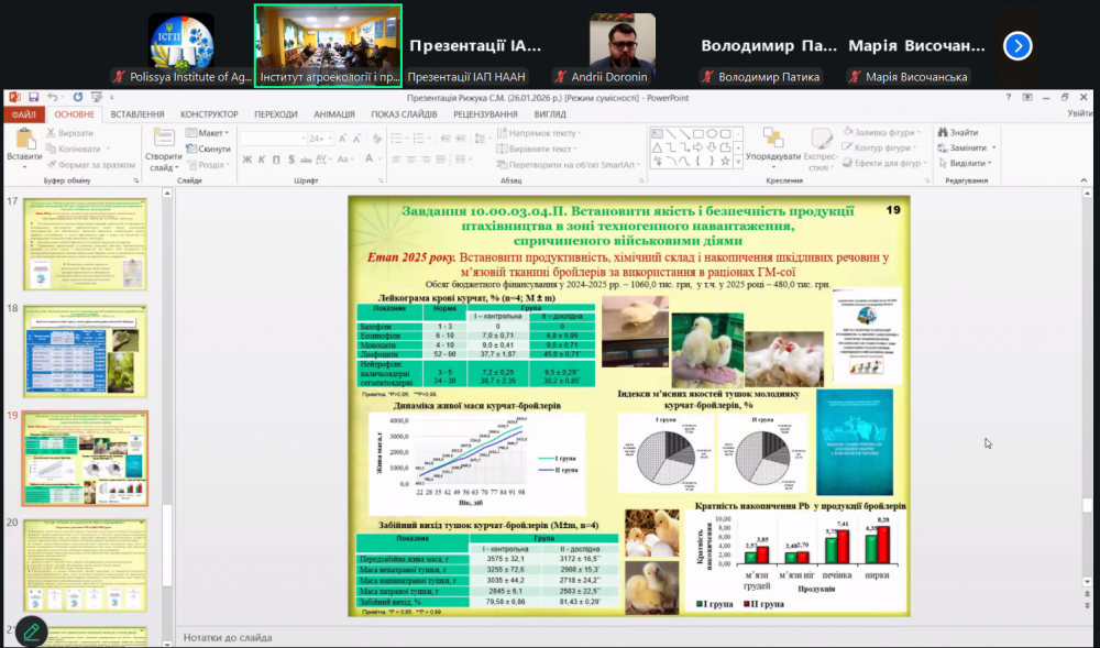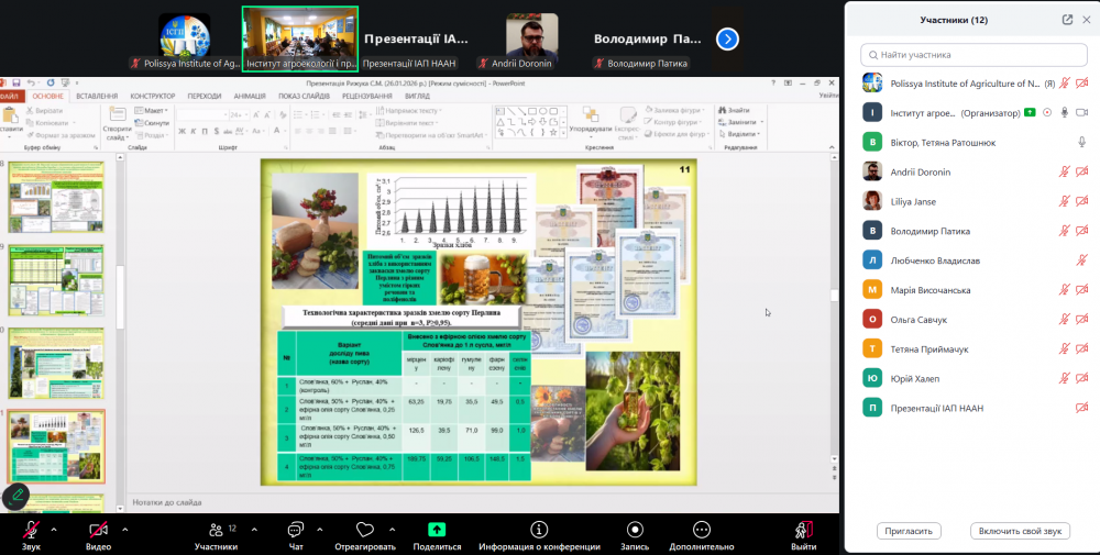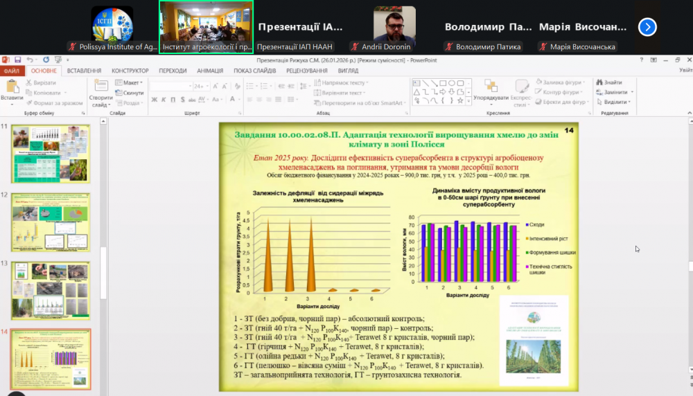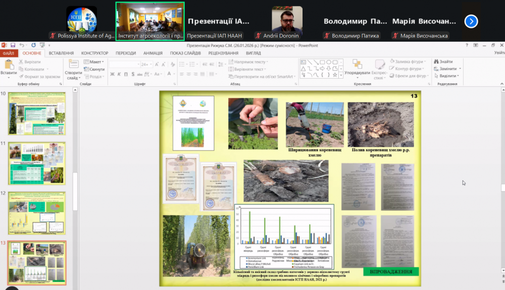 Зокрема, було заслухано звіти Національного наукового центру «Інститут ґрунтознавства та агрохімії імені О.Н. Соколовського» (академік НААН Станіслав БАЛЮК), Інституту сільськогосподарської мікробіології та агропромислового виробництва НААН (академік НААН Віталій ВОЛКОГОН) та Інституту сільського господарства Полісся НААН (академік НААН Сергій РИЖУК).